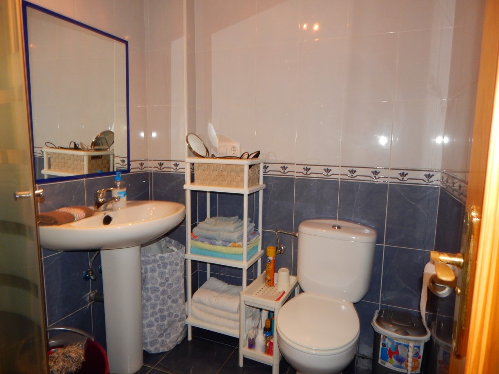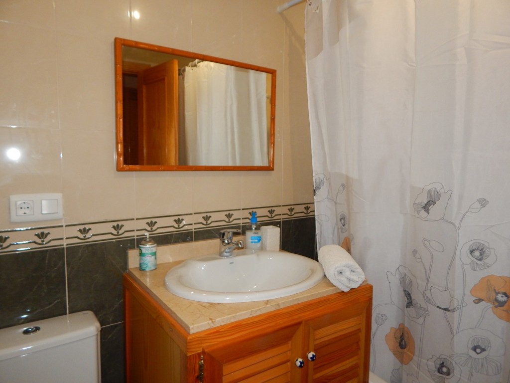 The property features two comfortable bedrooms with built-in wardrobes and two bathrooms—one en suite with a bathtub and the other with a shower—providing both privacy and convenience. The independent, fully equipped kitchen is ideal for practical everyday living, while the bright and spacious living-dining room opens onto a large private terrace, perfect for relaxing, dining outdoors, or simply soaking up the Mediterranean atmosphere.
