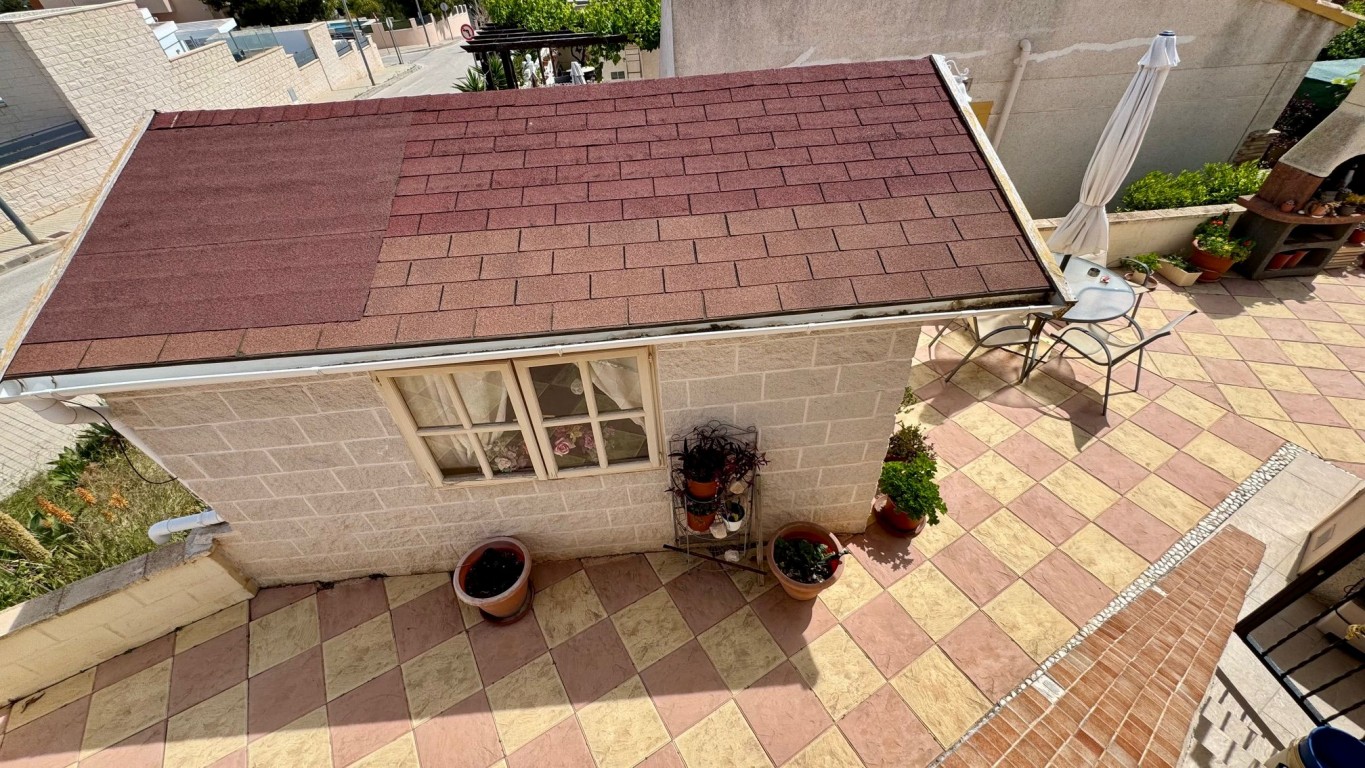 A sunny two bedroom villa on a corner plot. On the entrance there is a south facing ( winter) veranda. You enter from here into the living room with an open kitchen and exit to the big garden and terrace. There are two bedrooms and a bathroom. but outside is a garden shed now serving as atelier but before it was a 3th guest bedroom. You can park your car on the plot. In front of the house is the community pool. A nice and quiet urbanisation. You will love it! Call for a visit!