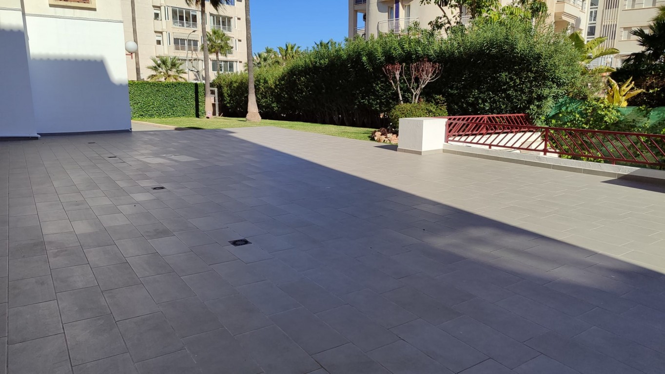 SUNNY CORNER TOP FLOOR APARTMENT WITH OPEN VIEWS TO THE MOUNTAINS AND THE TOWN CENTER. This unique top floor apartment is south west facing and very bright as on the corner. The apartment has a net area of 88 m2, aprox. like built area 100 m2, with a large living room with dining area and access to the south facing balcony with fantastic open views to the mountains and the town. Spacious kitchen with dining area and a laundry room next to, there is access to the kitchen from the living room. There is en entrance area to the apartment with wardrobes and a corridor with access to the 2 bedrooms and the 2 bathrooms. The master bedroom has an en suite bath with shower, and the second bedroom and the second bathroom also with shower have access from the corridor. In the apartment there is an installation of aircon and central gas heating (can need an update). A closed garage of 17 m2 is included in the price, and there is a communal roof terrace and a communal garden with a pool. The complex is very centrally located with short distance to restaurants, shops, the beach and public transport.