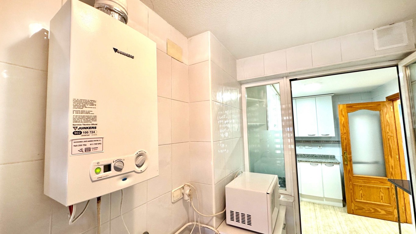 The separate kitchen is fitted with white units and includes electrical appliances, some of them new. Adjacent to the kitchen is a utility area (galería) with a washing machine, mains gas water heater and additional storage space.